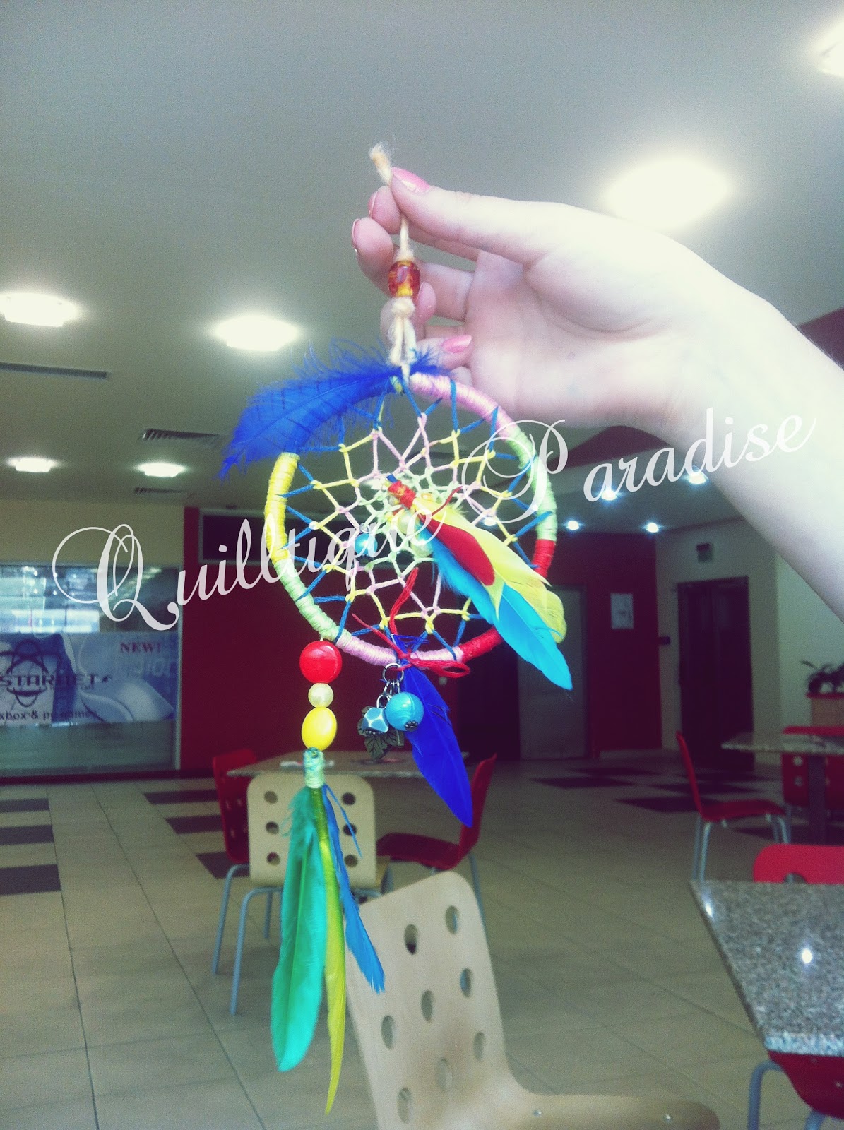 I know I know~It is too fast to be done with the paper version of the dreamcatcher but truth is..I really wanted to post both of my projects at the same time so I postponed the real dreamcatcher till the quilled one was ready. Sooo.dunno if ull like it as much as I do buut.